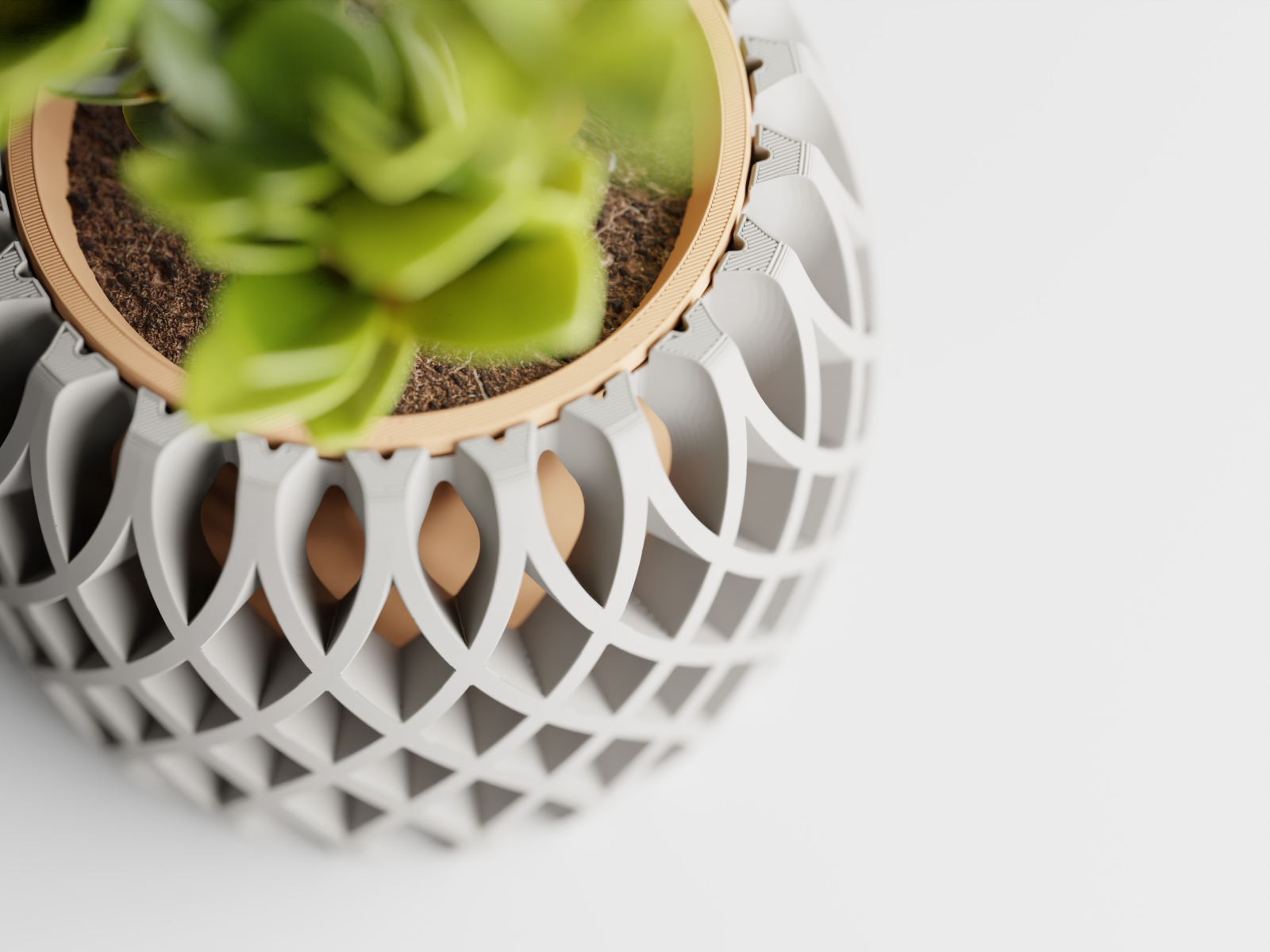 • Geometrie care respiră - structura deschisă dezvăluie frumos ghiveciul din interior